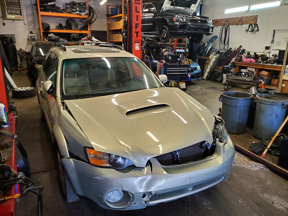 Our newest car is a 2005 Subaru Outback XT limited with 203K. The car has a Champagne gold opal (39J) in color. The interior of this car is tan in color and is in pretty rough condition. The seats both had damage and were torn down for parts. The car was in a front end accident and most all of the front end parts are damaged. The drivers rear door and passenger front door were torn down for parts the other two are in good condition and are available. The engine did not start due to the timing belt breaking in the accident. The engine will be torn down for part. The automatic transmission was not in good condition and will be torn down for parts. The car had a set of OEM 17" wheels from a 2007 WRX that have a 7 spoke design and are silver in color, All wheels are in good condition. One of the tires has damage so the set will be removed and the wheels will be sold as a set.