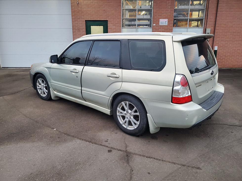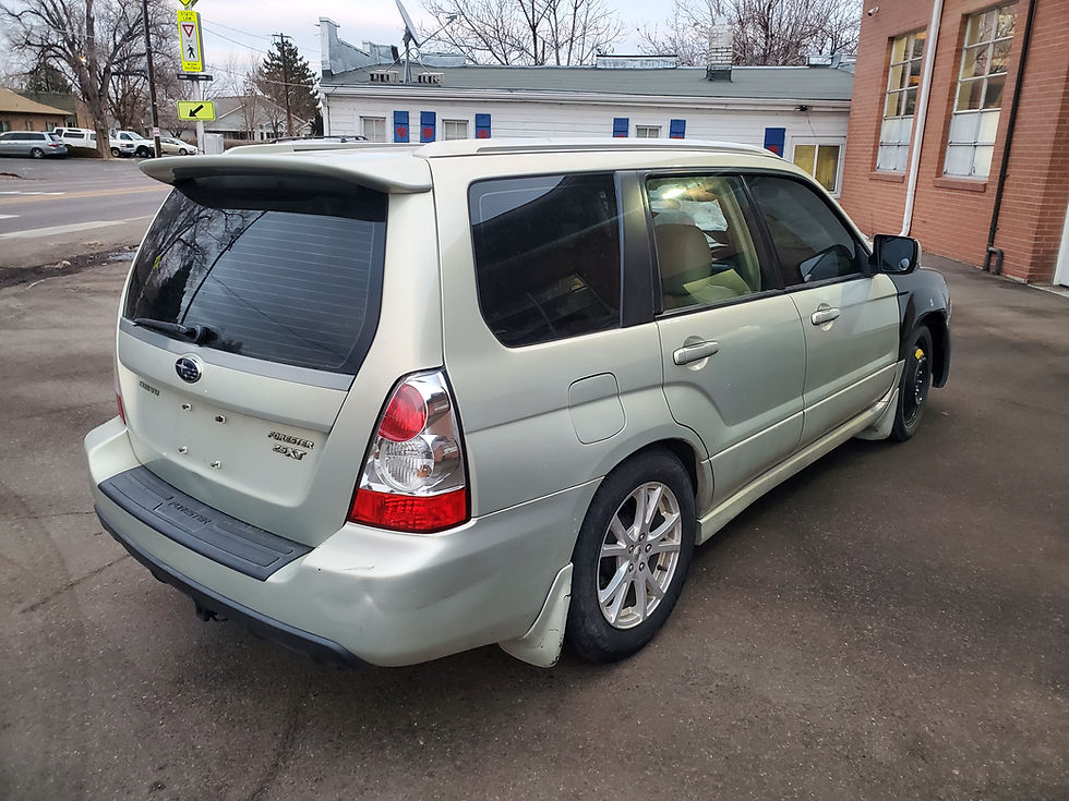 Our newest car is a 2006 Subaru Forester XT 2.5L with 188K on the odometer. The car has a Champagne gold opal (39J) exterior color. The interior is tan in color and the seats are leather in material. Both front seats have damage and will be torn down for parts. The engine ran and drove good with no knock or smoke. Once the engine was removed a leak down test was performed which came back with high numbers. So the engine will be torn down for parts. The car came with an automatic 4 speed transmission which drove and shifted good. All transmission and differential fluid was clean and clear when drained. The front end of this vehicle has been rebuilt and some of the parts are damaged. The hatch lid and rear bumper are in good condition. The car came with aftermarket Sport edition 16" Aluminum wheels. They have a 10 spoke design and are silver color. All wheels are in good condition with a 10 spoke design and are silver in color. The tires are 215/60/16 Mastercraft Stratus A/S tires have even wear with 6/32nds left on the tread.
