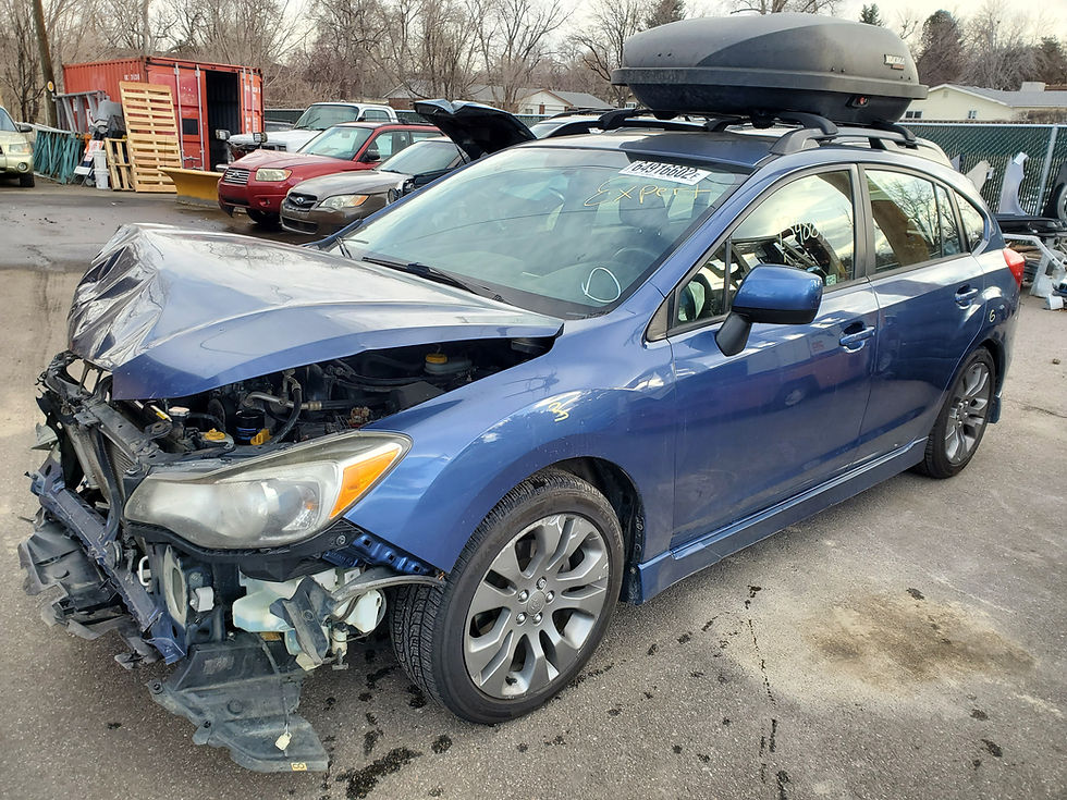 Our newest car is a 2013 Subaru Impreza wagon 2.0L with 134K on the odometer. The car has a Marine blue pearl (F9H) exterior color. The interior is black in color and the seats are cloth material. Both front seats are in good condition but the drivers seat side bolster has a small hole. Both seats have manual adjustments and are heated. The engine ran and drove good with no knock or smoke. All oil and coolant was clean and clear when drained. Once the engine was removed a leakdown test was performed which came back with great numbers on all cylinders. The car came with a CVT automatic transmission which drove and shifted good. All transmission and differential fluid was clean and clear when drained. The front end has damage from the accident. All doors and rear end parts are in good condition. The wheels from this car are OEM 17" aluminum wheels. They have a 10 spoke design and are gray in color. All wheels are in good condition with no bends or cracks that we can see. The tires are 215/50/17 Continental control contacts, The tires have 7/32nds left on the tread with even wear.