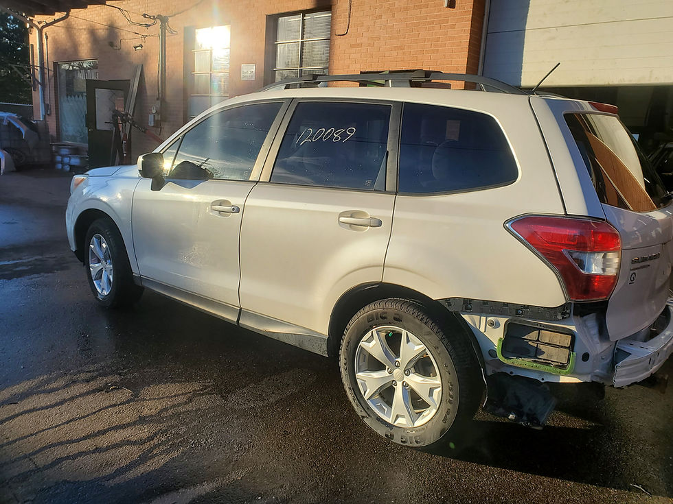 Our newest car is a 2014 Subaru Forester 2.5L with 120K on the odometer. The car has a Satin white pearl (37J) exterior color. The interior is gray in color and the seats are cloth material. Both front seats have bolster damage so they have been torn down for parts. The engine ran and drove good with no knock or smoke. All oil and coolant were clean and clear when drained. Once the engine was removed a leakdown test was performed which came back with great numbers on all cylinders. The car came with an Manual 6 speed transmission which drove and shifted good. All transmission and differential fluid was clean and clear when drained. All doors are in good condition, the fronts do have some minor dings. The front end parts are in good condition but the hood does have a big dent on the center of it. The rear end parts were damaged in the accident. The wheels from this car are OEM 17" wheels. They have a 5 spoke design and are silver in color. All wheels are in good condition with a 5 spoke design and are silver in color. The tires are 225/60/17 Big O Legacy A/S tires have even wear with 9/32nds left on the tread.