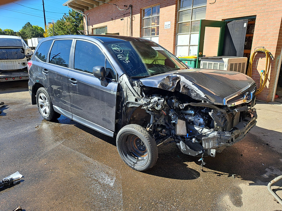 Our newest car is a 2015 Subaru Forester 2.5L with 27K on the odometer. The exterior color of the car is dark gray metallic, color code (61K). The interior is gray in color and the seats are cloth material. Both front seats are in good condition, no tearing or bolster damage. Both front seats have manual adjustments and are non heated. The drivers seat has been sold. The engine ran and drove good with no knock or smoke. All oil and coolant were clean and clear when drained. Once removed a cylinder leakdown test came back with good numbers on all cylinders. This car came with a 6 speed manual transmission that ran and shifted good through all gears. All transmission and differential fluid was clean and clear when drained. The hood, front bumper, passenger headlight, passenger fender and grill were damaged. The drivers side headlight and fender are in good condition. The passenger front door has damage and was torn down for parts. The other three doors are in good condition. The hatch assembly had damage and was torn down for parts. The rear bumper and taillights are in good condition. This car came with 17" Oem steel wheels. They have a 5 spoke design and are silver in color. two wheels have damage and two of the wheels are in good condition with no bends or cracks. One of the tires had damage. The tires will be removed and the wheels will be sold as singles.