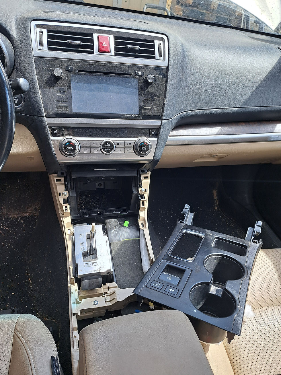 Our newest car is a 2017 Subaru Outback 3.6L wagon. This vehicle had 65K on the odometer. The color of the car is Tungsten gold metallic (K7U). The interior is tan in color and the seats are leather material. Both front seats are in good condition, no tearing or seam separation. Both front seats have power adjustments and are heated. The engine was not able to start or run due to damage to the fuse box and wiring harness. The car came with a CVT Automatic transmission, All transmission and differential fluid was clean an clear when drained. The rear transmission mount and tail housing had damage. All front end parts were damaged in the accident. All doors have minor dings and scuffs but are in good condition otherwise. The rear bumper, taillights and hatch assembly are in good condition. The car came with Oem Outback 18" wheels. The wheels have a 10 spoke design and are silver and black in color. One wheel had damage so the tires will be removed and the wheels will be sold as a singles.